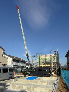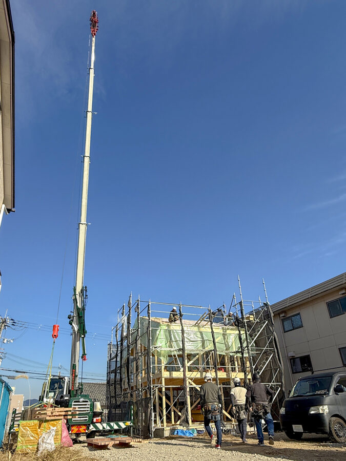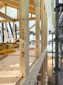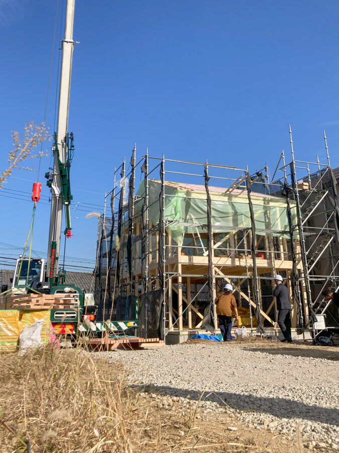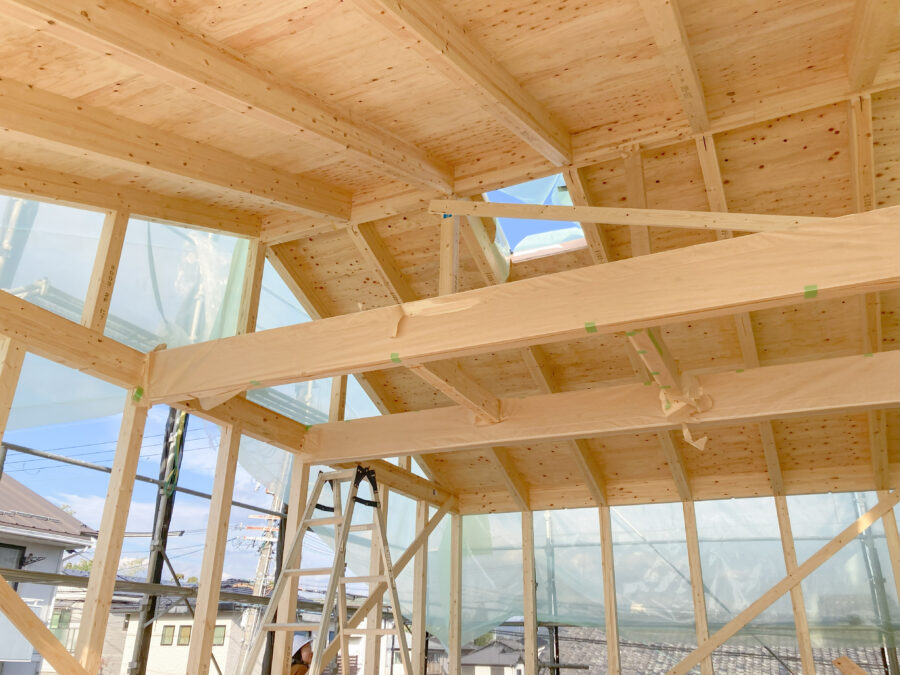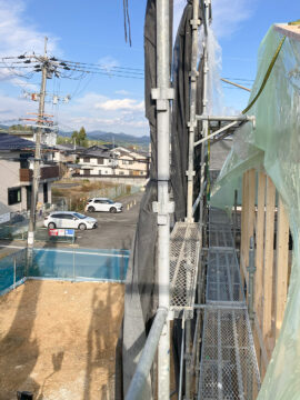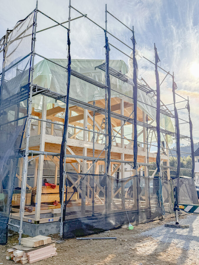 ジャーン。家のカタチになってる!足場に囲まれた白木がかわいい。