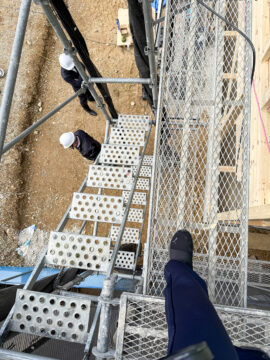 誰もがあこがれる(だろう)足場階段であるが、なかなか高さがあって怖い。
