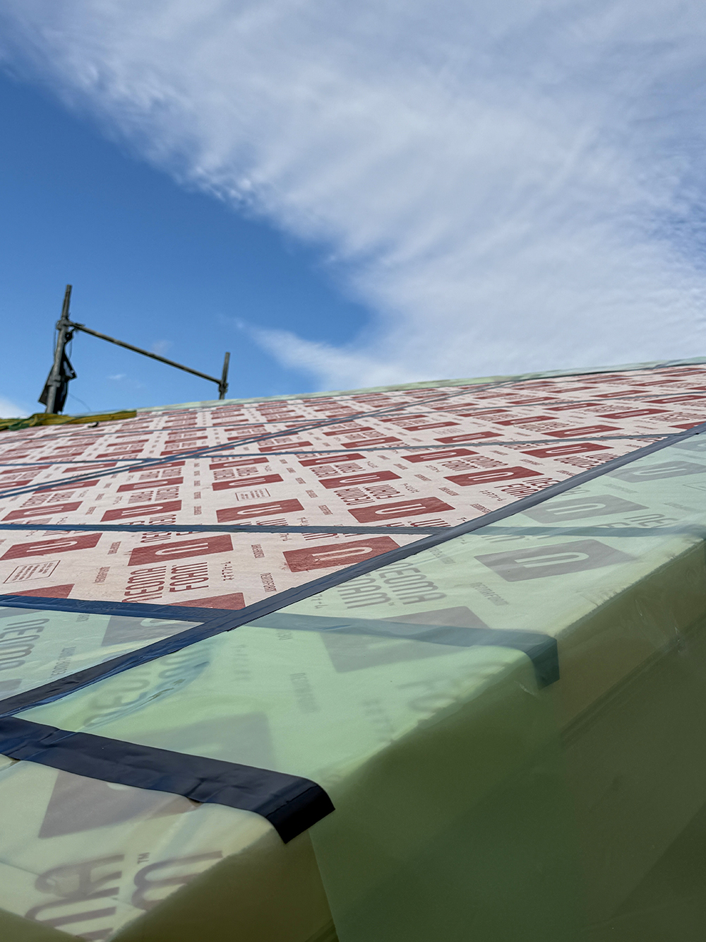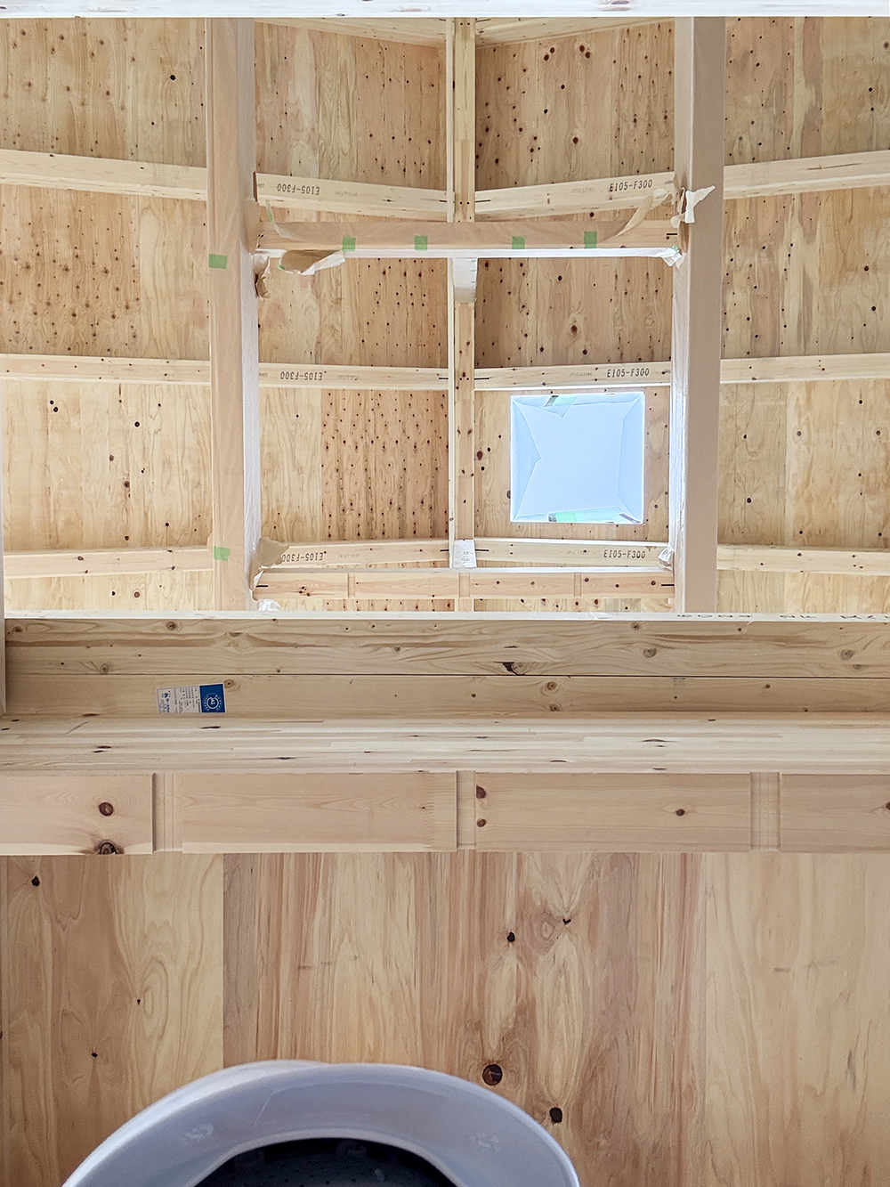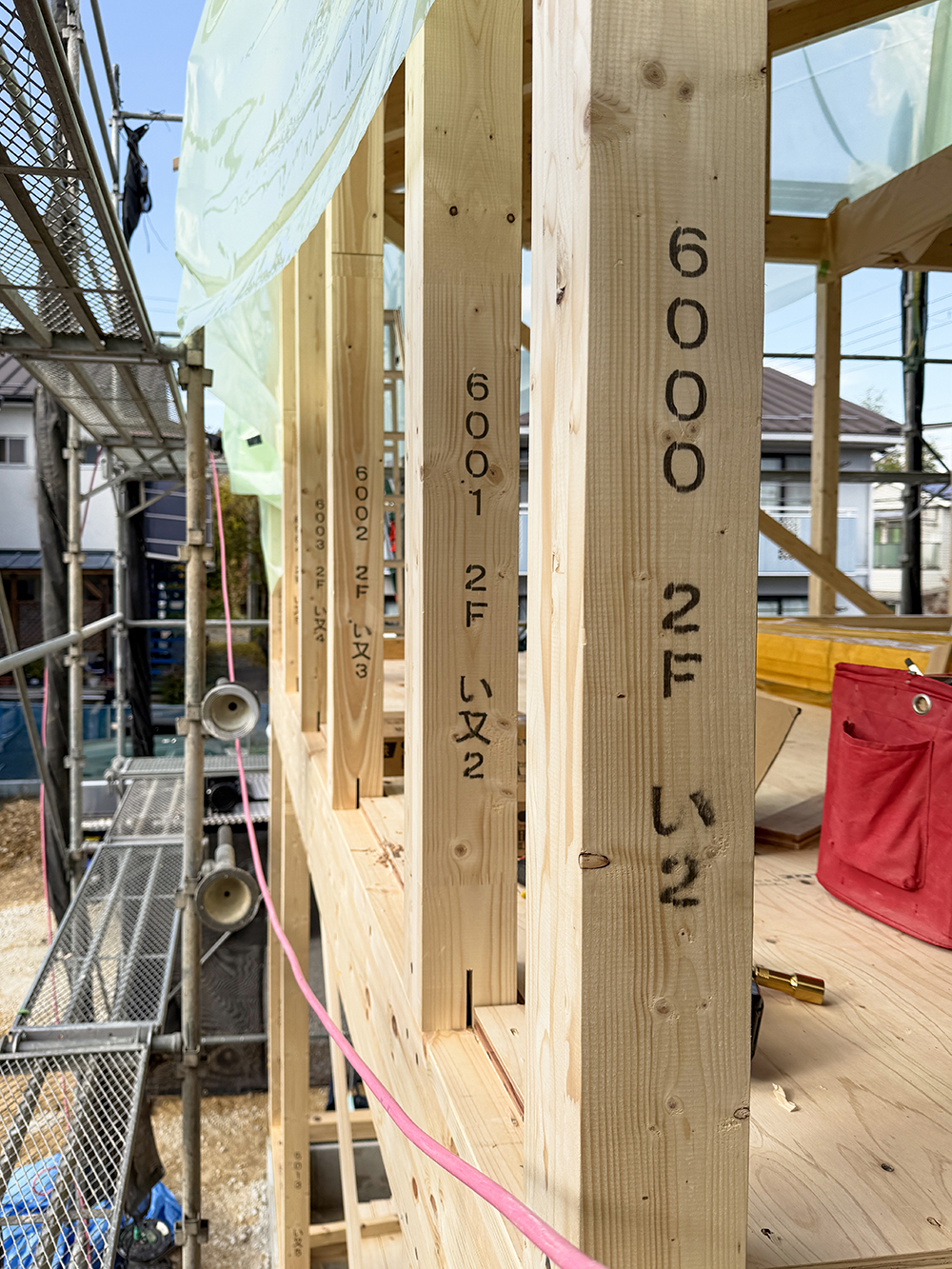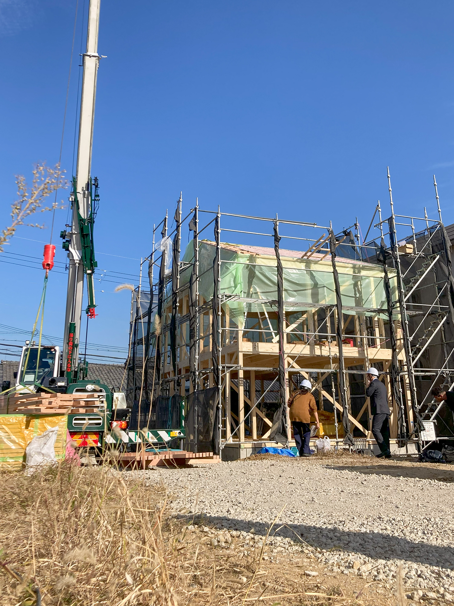 ジャーン。家のカタチになってる!足場に囲まれた白木がかわいい。