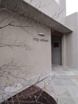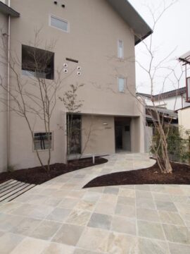 ゆるやかな曲線を描く、タイル張りのアプローチを通って、