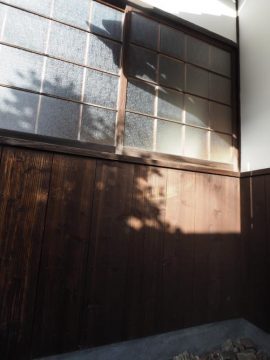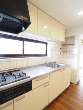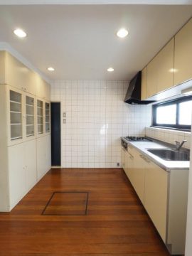 ペンキ塗りの食器棚、白いタイル、木枠の扉。