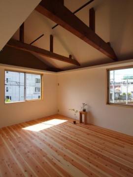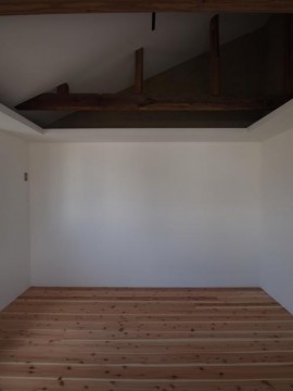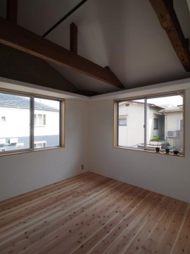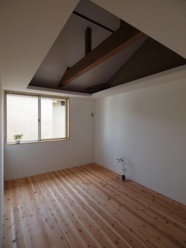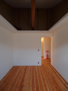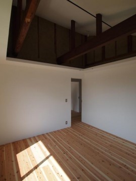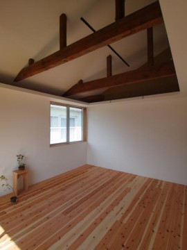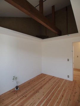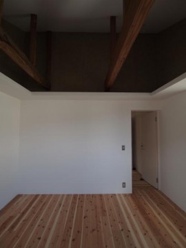 《2階》床:無垢フローリング仕上げ/壁:塗装、一部土壁/天井:勾配、塗装仕上げ/全室天井棚付き