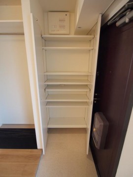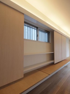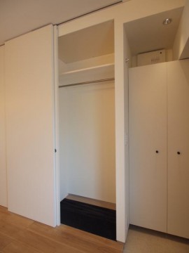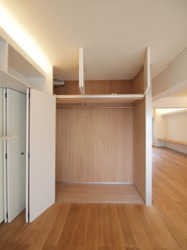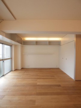 東側の壁面には、一直線に棚板が、