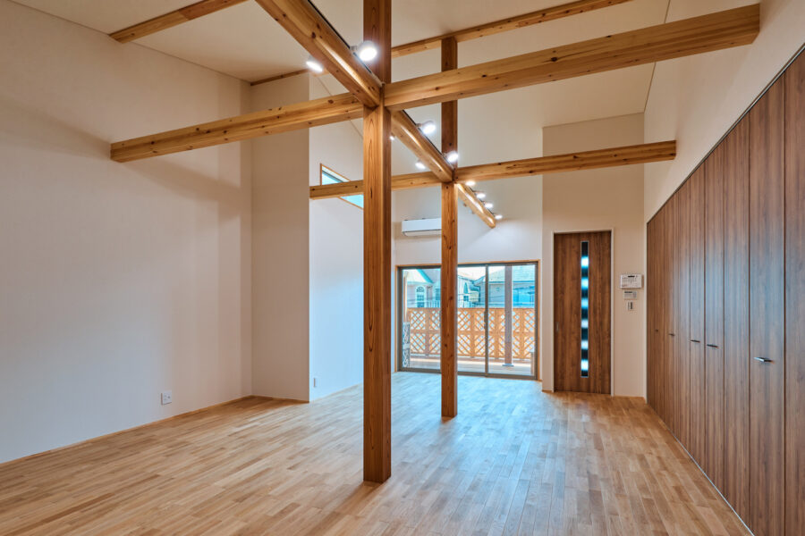開放感のある勾配天井に、梁が交差する面白い内装。